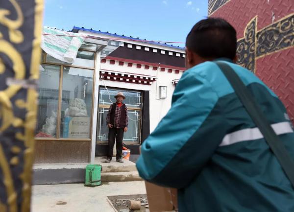 格桑次仁走進普瑪江塘鄉沙空村為一戶村民送郵包(7月27日攝)