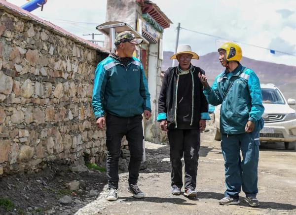 次仁曲巴(左一)和格桑次仁(右一)在普瑪江塘鄉沙空村投遞郵件時和當地村民聊天(7月27日攝)