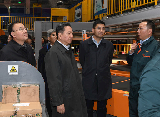 李小鵬(右三)察看了解郵政自動化分揀流程。