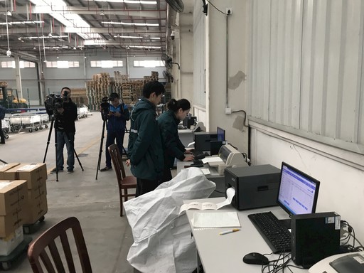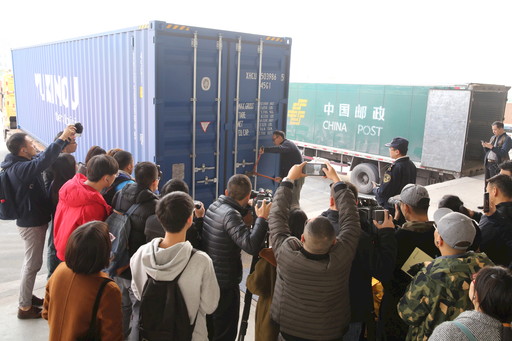 在海關工作人員及眾多媒體的見證下,運郵集裝箱開箱。