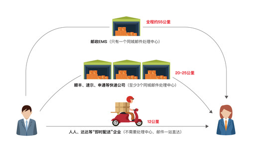 “在同城業務市場,客戶對時限的極致需求正是傳統快遞企業的‘痛點’,但卻是‘即時配送’行業的‘亮點’。”據張德新介紹,同樣一件從廣州市番禺區發往海珠區的同城快遞,通過EMS寄遞全程約55公里,但通過順豐、速爾、申通等快遞公司寄遞只需20~25公里;如果通過人人、達達等“即時配送”企業寄遞只需12公里。因為廣州郵政EMS的當日遞同城郵件處理中心只有一個,而順豐、速爾等快遞公司都有至少3個同城郵件處理中心,而“即時配送”企業不需要處理中心,郵件一站直達。