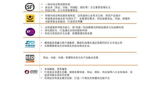 快遞企業在發展戰略中各有側重,而在共性中都包含了向綜合服務商的轉化、注重服務質量的提升以及科技賦能等方面(見圖表2)。