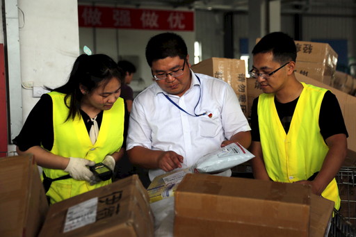 沈振國(中)抽查郵件分揀質量。