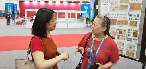 此次世界郵展評審委員會主任焦曉光(右)在展會現場接受《中國郵政報》特派記者王楚蕓采訪。