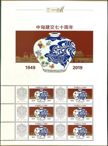 為慶祝中國與匈牙利建交70周年,匈牙利于5月23日發(fā)行了一套《中匈建交七十周年》紀念郵票(圖4),并在匈牙利國家行政大學內(nèi)舉辦了發(fā)行儀式。該套郵票共有2枚,由來自中國的趙文潔和匈牙利的設(shè)計師瑪媞·阿萊克絲分別設(shè)計1枚,在兩枚郵票的背景當中都能看到中國天安門和匈牙利國會大廈的部分圖形元素。匈牙利設(shè)計師采用了中國的祥云作為主要圖案,并在紀念周年的數(shù)字中融入了匈牙利的傳統(tǒng)刺繡花紋。中國設(shè)計師表示瓷瓶代表著“平安與和平”,圓形瓶體則代表著“友好與圓滿”,并將中國牡丹以及匈牙利傳統(tǒng)花卉圖案與青花瓷瓶相結(jié)合,象征兩國政府和人民之間親切、緊密的友誼。