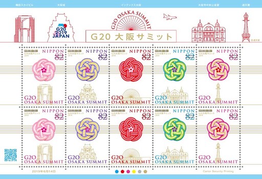 在第二季度中,最受全球關(guān)注的非在大阪舉行的二十國集團領(lǐng)導人峰會莫屬。日本為此發(fā)行了一套5枚郵票,圖案采用日本水引,為呼應(yīng)主辦地大阪,郵票圖案的水引為梅花造型(圖5)。水引是日本儀式禮品上的繩結(jié),代表結(jié)緣或是召喚幸福。郵票下方5個大阪地標,包括梅田藍天大廈、大阪城、大阪國際會展中心、大阪市中央公會堂、通天閣。此次峰會標志以富士山為設(shè)計主題,富士山的“山頂”和“朝日”象征著全球經(jīng)濟增長和繁榮。在富士山的下面,盛開的櫻花象征著春天的到來,也預(yù)示著全球經(jīng)濟的美好未來。