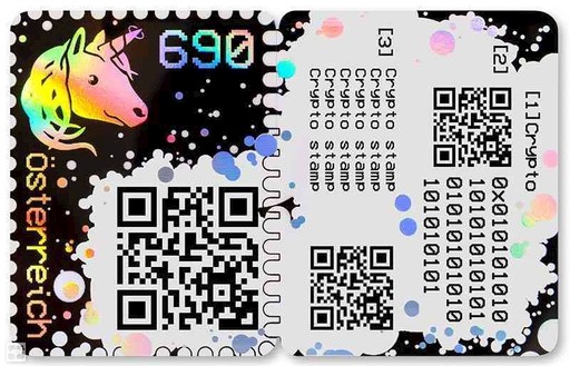 奧地利于6月11日發(fā)行世界首枚區(qū)塊鏈(加密貨幣)郵票(圖6)。該枚郵票不僅可以作為普通郵票使用,也可以與加密貨幣一樣作為數(shù)字資產(chǎn)儲存在數(shù)字錢包中永久收藏。郵票設(shè)計融合了郵票和自動化識別碼,左側(cè)包含獨角獸圖案和二維碼,右側(cè)包含以太坊區(qū)塊鏈錢包持有人訪問代碼和另一附加碼,可以通過以太坊錢包轉(zhuǎn)讓或轉(zhuǎn)移,每一次交易都會被永久記錄在區(qū)塊鏈中。