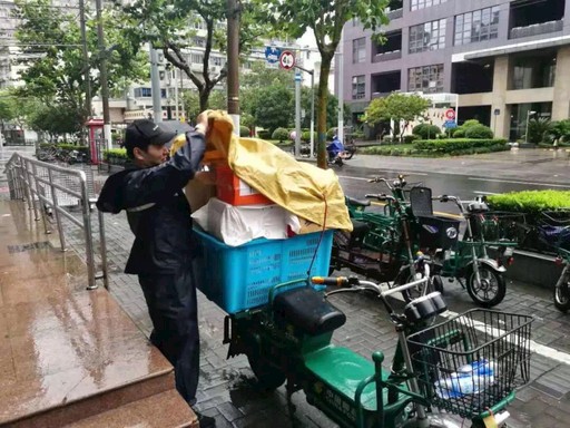 上海:臺風(fēng)天氣,上海市1.1萬名“郵政小哥”一如既往堅守投遞一線,不負(fù)客戶所托,確保百姓用郵。李璐瑤  攝