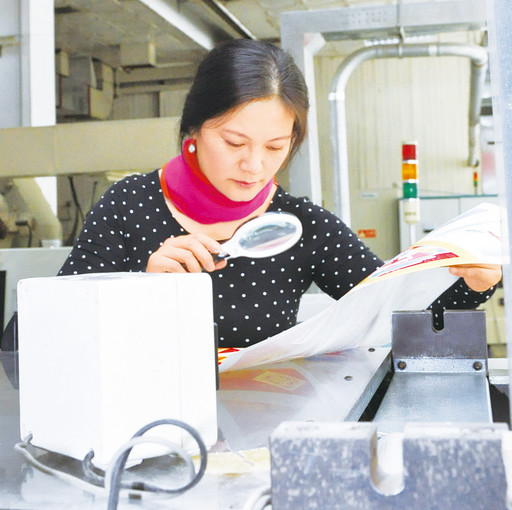 郵票設計者原藝珊查看郵票印制情況。  記者 陸航 攝
