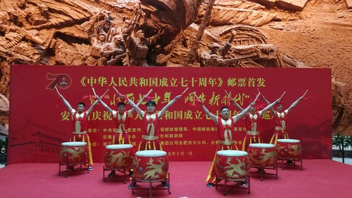 10月1日15時,由中共安徽省委宣傳部、安徽省郵政管理局、安徽省郵政分公司、安徽省集郵協會、合肥市文化和旅游局主辦的《中華人民共和國成立七十周年》紀念郵票首發暨“壯麗七十年 闊步新時代”集郵巡展在渡江戰役紀念館舉行。活動中,安徽省分公司帶來了快閃表演《我和我的祖國》,全場同唱贊歌,歌頌祖國。圖為合肥市郵政分公司員工帶來的《鼓舞盛世 揚帆遠航》表演,強勁有力的鼓聲表達了慶祝新中國成立70周年的喜悅之情。(徐吉波 攝影報道)