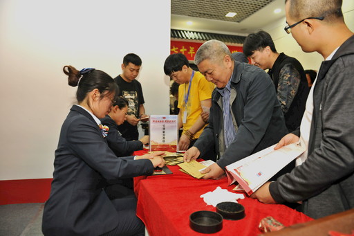 9月25日,“壯麗七十年 闊步新時代”慶祝新中國成立70周年全國集郵文化活動(太原站)暨山西省第十一屆集郵展覽拉開帷幕。此次郵展為全省綜合性郵展,規模為286框。持續三天的展覽,展出了以新中國成立70年來在政治、經濟、文化、軍事等領域取得的偉大成就為主題的郵集,展品內容豐富多彩。圖為郵政工作人員特別提供紀念戳加蓋服務?! 跎轿饔浾?nbsp; 裴效華 攝影報道