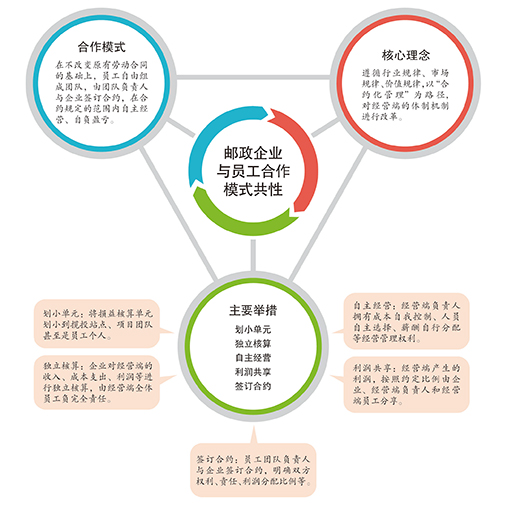 浙江義烏郵政的“準(zhǔn)加盟”制、云南郵政的“創(chuàng)客計(jì)劃”、山東郵政的“合伙人”制以及湖南郵政的“眾創(chuàng)眾享工程”,盡管模式千差萬別,但原理大同小異,若從方法論的角度探究,離不開基于“合約”之上的資源配置,主要體現(xiàn)在:劃小經(jīng)營核算單元與所有權(quán)分配思想的建立;內(nèi)部市場化與經(jīng)營責(zé)任單元的利益分配;利益共同體的形成與體制機(jī)制改革的真正落地。