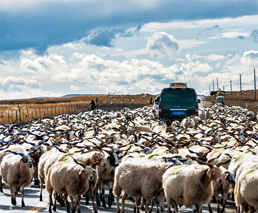 哈弄奪機(jī)的郵車被羊群“包圍”。