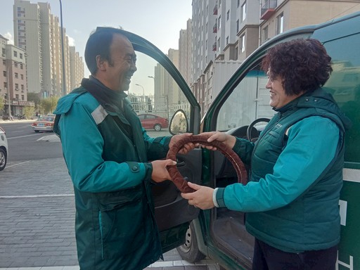 內蒙古自治區(qū)包頭市郵政分公司東河區(qū)分公司惠民攬投部主任邢愛萍(右)為駕駛員聞杰(左)送上了特別準備的保暖方向盤套,為員工的冬季外出作業(yè)提供有效保護。□白新華 攝影報道