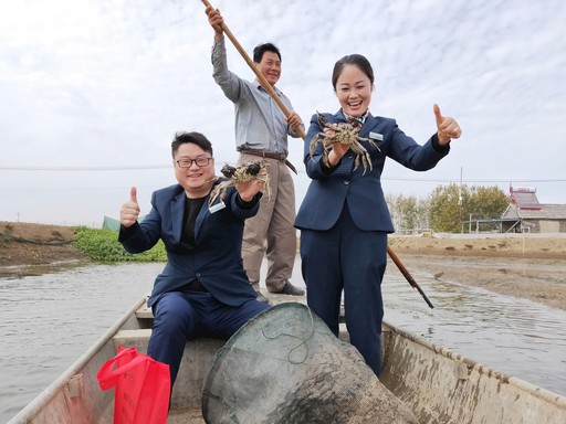 “王哥呢?”“他在場上曬稻子。”“走,去你家蟹塘看看。”還在曬糧食的王成廣接到唐傳美的電話,特意趕到螃蟹塘。他劃起船,撐起篙,載著陳仕珍和趙旭陽體驗他家水肥蟹美的收獲季。“陳局長,我給你們拉一籠上來看看。”“哎呀,大螃蟹。來來來,幫我拍個視頻,我要把老哥的螃蟹曬到抖音上去。”豐收季,郵政人比糧農(nóng)蟹戶們更開心。