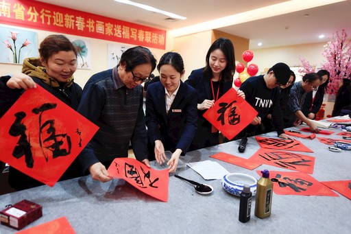 1月9日,郵儲銀行湖南省分行直屬支行內(nèi),書畫家們正為客戶書寫“福”字和春聯(lián)。當天,湖南省分行舉辦了迎新春書畫家送福寫春聯(lián)活動。書畫家張青渠、袁紹明、俞成林、張楚務、胡偉一行來到網(wǎng)點,現(xiàn)場潑墨揮毫,通過寫春聯(lián)、寫“福”字的方式,送出2020年的新春祝福,共同迎接新春的到來。 □楊伊媛 攝影報道