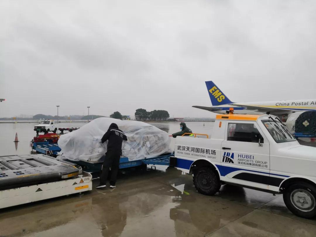 隨著飛機先后抵達,武漢天河機場接卸作業迅速展開。由于下著小雨,郵航武漢辦事處人員在物資的機坪盤運中,緊急加蓋塑料布,防止物資被雨淋濕。通過緊張的作業,郵航武漢辦事處均在半小時內先后將兩架專機運抵物資移交陸側作業,現該批物資正由武漢郵政迅速運往接收方。