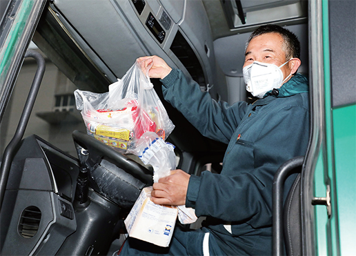 上海郵區(qū)中心局黨員駕駛員程勛江展示單位給他們準(zhǔn)備的食品,他全程要依靠這些“能量”將防疫援助物資運達(dá)武漢。□許雨舟 攝影報道