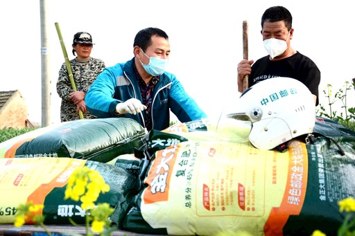 江蘇省射陽縣郵政分公司開展“戰(zhàn)疫情、搶農(nóng)時(shí)、郵我助,郵農(nóng)一心保春耕“活動(dòng),基層員工利用班前班后時(shí)間將農(nóng)民需要的復(fù)合肥配送到農(nóng)民家門口、田間地頭,并組織志愿者協(xié)助缺勞力戶為莊稼施肥鋤草。截至3月17日,該分公司已向全縣農(nóng)民配送復(fù)合肥546噸,幫助17戶缺勞力戶解除農(nóng)活上的后顧之憂。圖為通洋支局投遞員將肥料送到農(nóng)戶地頭。□劉德林 攝影報(bào)道