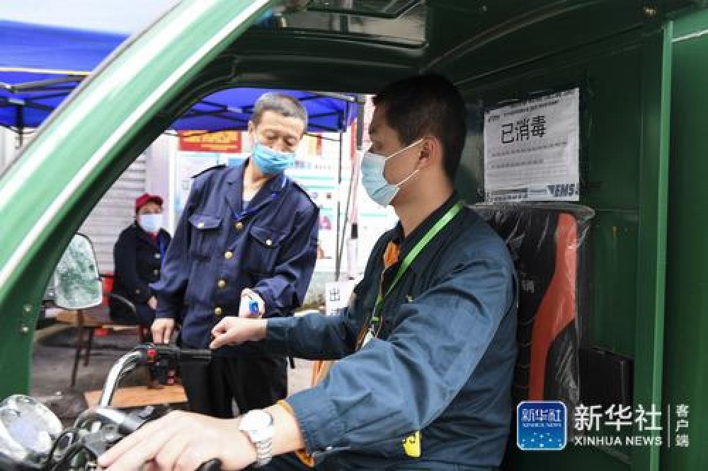 3月23日,廣西南寧郵政部門工作人員在進(jìn)小區(qū)前配合工作人員測量體溫。