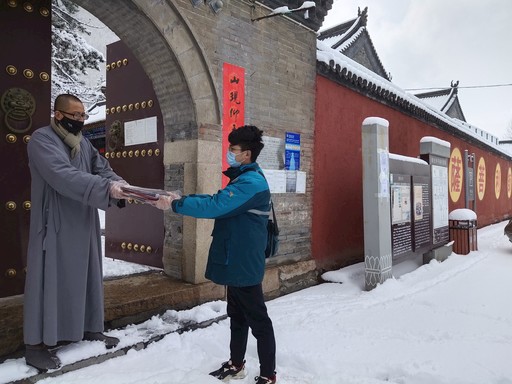 接下來,高健喻到了第二個(gè)投遞點(diǎn)——善財(cái)洞。由于疫情防控期間寺院實(shí)行封閉管理,到了寺院門口后,小高撥通客堂師父釋仁恒的電話,告知郵件來了。很快,釋仁恒打開厚重的寺門接過報(bào)紙說:“小高,這么大的雪你還過來了?每天看看你送來的報(bào)紙,了解天下大事,對(duì)我們也是一種很好的修行。”