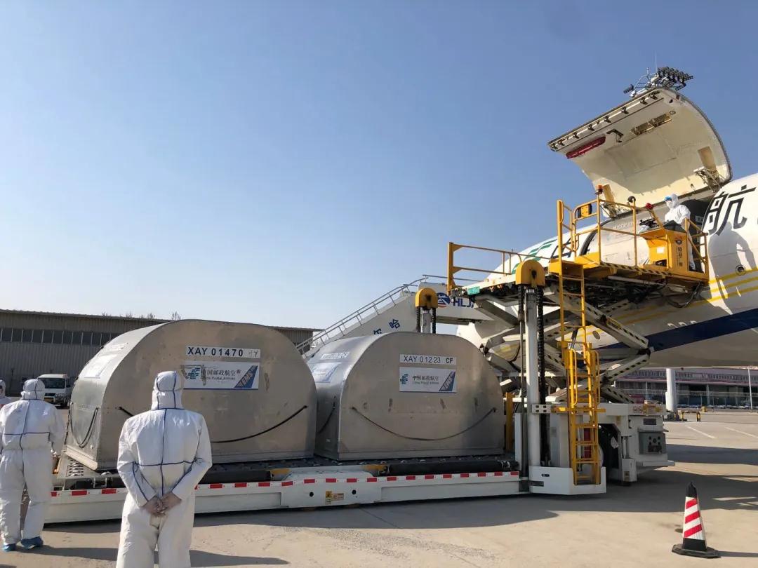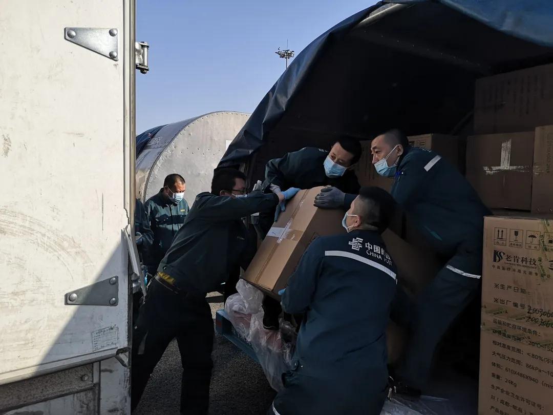 哈爾濱郵區中心局員工將郵航包機運抵的醫用物資進行裝車。