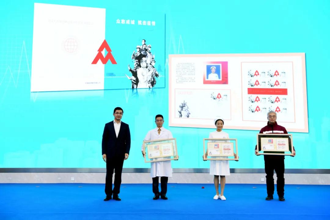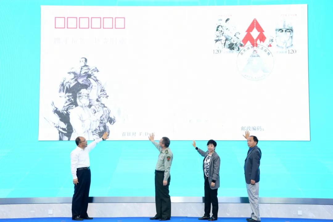 楊傳堂、梁言順、馬軍勝、李斌、梁惠玲、劉愛力、張金良共同為郵票揭幕,中央軍委后勤保障部衛生局副局長徐勤耕、財政部經濟建設司一級巡視員宋秋玲、中國人口福利基金會副理事長武家華、康寧共同為郵票首日封揭幕。劉愛力向中國紅十字會總會捐贈抗擊疫情慈善款,張金良向北京醫院呼吸與危重癥醫學科副主任許小毛,北京大學人民醫院護理部護士長趙彥,中國疾控中心駐黃岡檢測隊隊長、病毒病所曾毅院士實驗室副主任張曉光三名抗擊疫情醫務工作者代表捐贈郵折。
