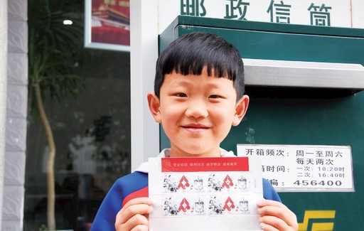 5月11日,河南省安陽市滑縣紅旗路郵政營業(yè)廳外,一位小郵迷成功購得心儀的《眾志成城 抗擊疫情》郵票,興奮地展示起來。牟會(huì)鋒 攝