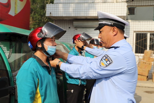 5月15日,山西省陽泉市交警二大隊聯合山西省陽泉市郵政分公司共同開展 “警企合作共建文明交通,‘一盔一帶’守護安全出行 ”勸導快遞騎手佩戴安全頭盔活動。該大隊長賈勇慧將10個安全頭盔贈給該分公司投遞人員,倡導投遞員駕車系好安全帶,駕乘摩托車、電動車戴好安全頭盔等,做到安全駕駛、生命第一。 □劉靜雅 攝影報道