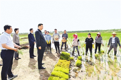 在黃河水滋養下,寧夏平原土地肥沃、物產豐富,素有“塞上江南”之稱。9日下午,習近平來到銀川市賀蘭縣稻漁空間鄉村生態觀光園,聽取寧夏現代農業發展、農業合作社帶動農民增收致富運營模式等情況匯報,觀看寧夏特色農產品展示,了解稻漁種養業融合發展的創新做法。習近平登上觀景塔,俯瞰園區全貌。微風輕拂,秧苗搖曳,一派生機勃勃。他沿著田埂走進稻田,同正在勞作的村民們親切交談。村民們告訴總書記,現在有土地流轉費、勞務費,還有年底分紅,收入提高了,也有保障了。正值放魚時節,習近平舀起魚苗、蟹苗,放進田邊水渠。習近平強調,發展現代特色農業和文化旅游業,必須貫徹以人民為中心的發展思想,突出農民主體地位,把保障農民利益放在第一位。要探索建立更加有效、更加長效的利益聯結機制,確保鄉親們持續獲益。要注意解決好稻水矛盾,采用節水技術,積極發展節水型、高附加值的種養業,保護好黃河水資源。目前,疫情防控形勢穩步向好,要繼續抓好常態化疫情防控,加快恢復社會生產生活正常秩序。