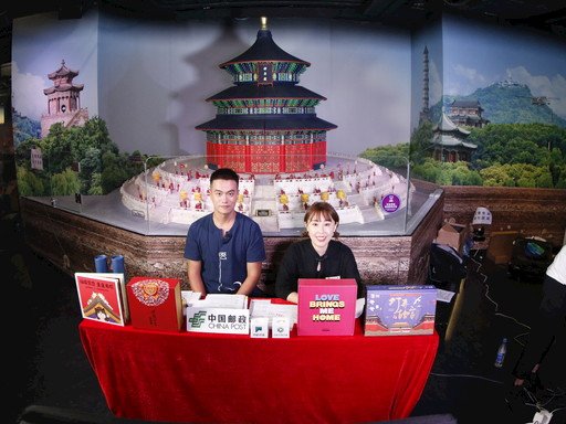 北京郵政邀請的主播在“大城小像·北京”城市微縮景觀博物館現場直播帶貨故宮系列郵品。