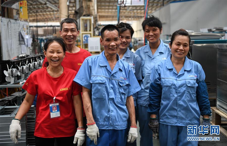 在佛山市三水區(qū)廣東星星制冷設(shè)備有限公司車間內(nèi),來自四川涼山彝族自治州鹽源縣的何公各(左二)和工友們合影(6月22日攝)。 新華社記者 鄧華 攝