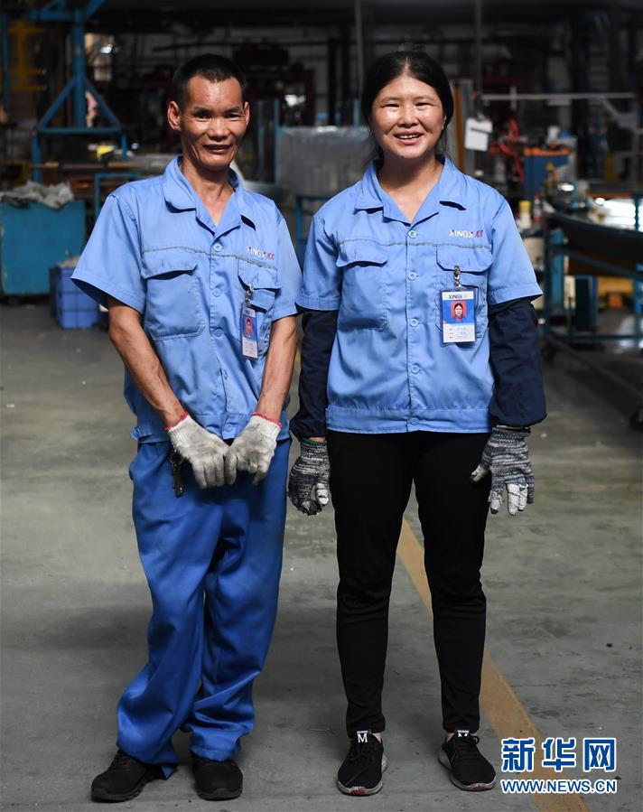 在佛山市三水區(qū)廣東星星制冷設(shè)備有限公司車間內(nèi),來自四川涼山彝族自治州鹽源縣的貧困務工人員李力挖(左)、何公各夫婦合影(6月22日攝)。 新華社記者 鄧華 攝