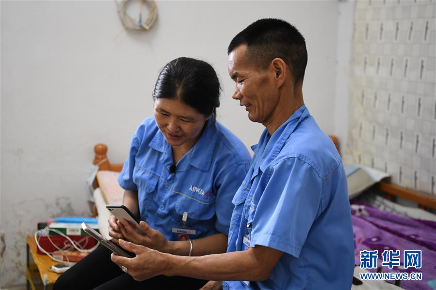 在佛山市三水區(qū)廣東星星制冷設(shè)備有限公司提供的夫妻宿舍里,李力挖(右)、何公各在休息時間玩手機(6月22日攝)。 新華社記者 鄧華 攝