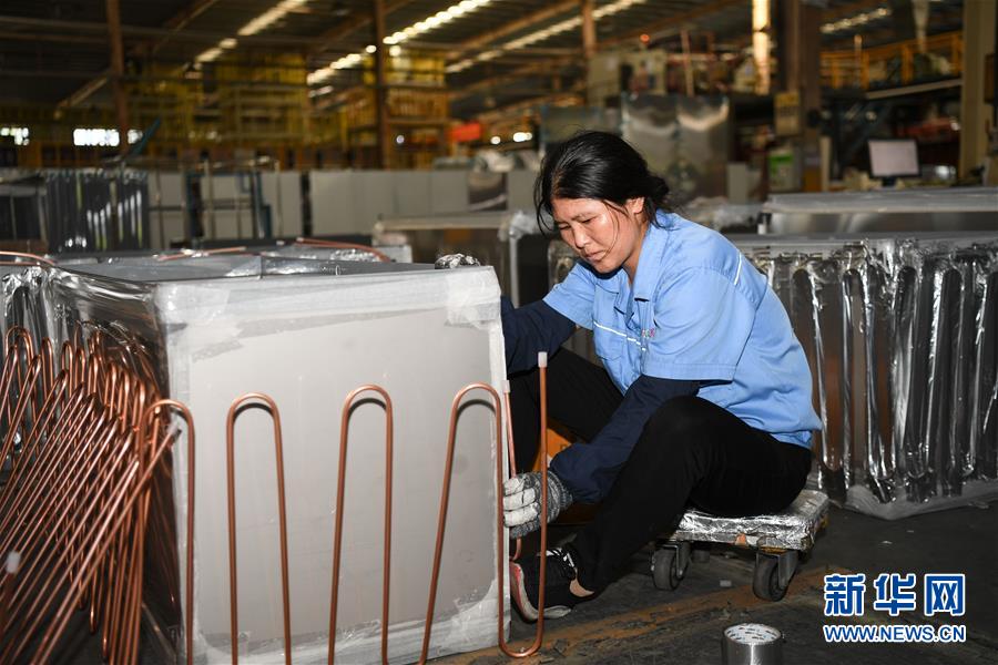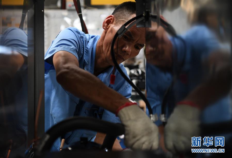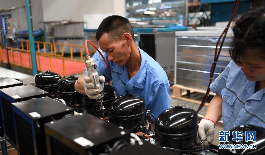 在佛山市三水區(qū)廣東星星制冷設(shè)備有限公司車間內(nèi),來自四川涼山彝族自治州鹽源縣的何公各在組裝設(shè)備(6月22日攝)。 新華社記者 鄧華 攝