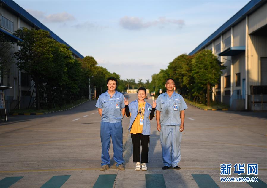 在佛山市三水區(qū)廣東星星制冷設(shè)備有限公司,來自四川涼山彝族自治州鹽源縣的貧困務工人員伍元國、易爭咪、董正軍(從左至右)下班后在廠區(qū)合影,他們通過東西部扶貧協(xié)作在這里實現(xiàn)就業(yè)(6月22日攝)。 新華社記者 鄧華 攝