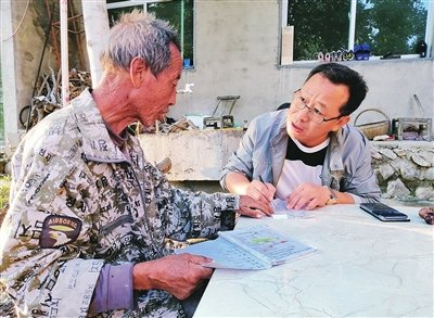 郝軍(右)向有經驗的村民請教種田經驗。□楊明 攝
