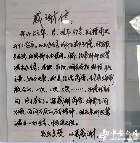 9月22日一大早,郵儲銀行亳州市立德鎮(zhèn)支行剛剛營業(yè),一位老大爺匆匆走進網(wǎng)點大廳,對工作人員說:“你們負責人在嗎?”還沒等工作人員回話,老大爺接著說:“我是來送感謝信的,感謝你們工作人員不厭其煩的教會我辦理各項業(yè)務(wù)。”邊說老人邊從口袋里掏出一封手寫的感謝信。