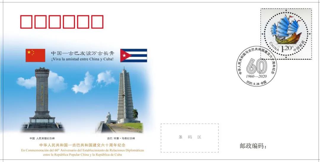 《中國古巴建交60周年紀念封》正面圖案采用中國人民英雄紀念碑和古巴何塞·馬蒂紀念碑,體現(xiàn)中國和古巴兩國不屈不撓爭取民族解放的偉大抗爭精神。紀念封上所貼郵票為《夢想啟航》個性化郵資主圖,郵戳體現(xiàn)兩國建交年份及建交60周年,紀念封的背面為說明性文字及發(fā)行信息。何塞·馬蒂是古巴詩人、民族英雄、思想家,他從15歲起就參加反抗西班牙殖民統(tǒng)治的革命活動,42歲便犧牲在獨立戰(zhàn)爭的戰(zhàn)場上,他短暫的一生完全獻給了爭取祖國古巴獨立和拉美自由的事業(yè)。