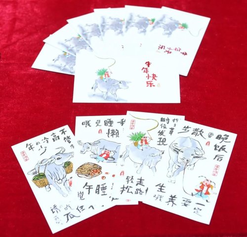 《牛年快樂》普通明信片的郵資圖選取了第二輪生肖牛郵票剪紙原作者齊秀花的作品,由王虎鳴設計,畫面中的牛昂首向上、充滿力量。兩套明信片分別采用水彩繪畫及水墨手繪形式,畫面溫暖充滿童趣,展現出濃厚的春節民俗特色,分別由景紹宗及段雅婕、潘振磊設計?!缎脸蠹椤窐O限明信片由韓美林先生設計指導,明信片正面左下角圖案及背面圖案與郵資圖相同,形成極限概念,四枚明信片廣告面可組成完整的“恭賀新春”吉祥短語。祝福卡《牛年如意》《新春送?!罚嬅嬉越〈T而充滿活力的牛為主要形象,傳遞國裕民康的良好祝愿,分別由張旺、武世寧設計。2021年賀年專用郵票分別為《國裕家康》《新春送?!罚瑑商奏]票構成的小全張,以紅色、金色為主體色調,將“?!弊?、甲骨文的“門”字及中國書畫中的斗方元素進行組合設計,寓意歲月更新福滿門、開門見福迎新春?!秶<铱怠酚身n美林設計,《新春送福》由陳楠設計。相關產品自11月5日起在全國郵政網點銷售,廣大用戶可在郵政網點和中國郵政微商城明信片專區選購。