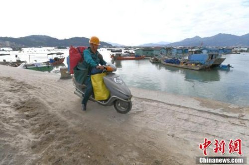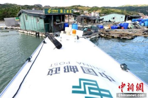 11月12日,石進全開著快艇穿梭在三都澳海上漁村?!半p十一”剛過,福建省寧德市蕉城區海上郵遞員石進全比往常更加忙碌。作為三都澳海域唯一的海上郵遞員,他要服務周邊上千戶漁排人家以及4座海島上8個行政村的信件和包裹。石進全的父親曾搖著櫓為鄉親服務了23年,子承父業的他,也已經在這條海上郵路走了20多年。