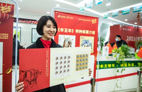 1月5日,在長春郵政站前集郵專賣店,工作人員展示《辛丑年》特種郵票。新華社記者 張楠攝