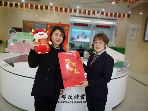 郵儲(chǔ)銀行山東省分行在牛年春節(jié)即將到來(lái)之際,為客戶送上暖暖的節(jié)日祝福。圖為淄博市分行在廳堂舉辦"金牛送福”抽獎(jiǎng)活動(dòng),為來(lái)辦業(yè)務(wù)的客戶派送“小金牛”和福字對(duì)聯(lián)禮包,營(yíng)造良好的節(jié)日氛圍。
