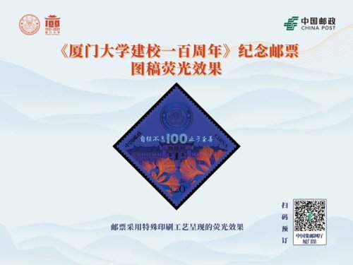 該套郵票由史淵設計師設計,北京郵票廠采用兩色雕刻印制,熒光燈下,鳳凰花花團簇擁下的廈門大學校訓,躍然方寸之上。