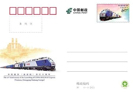 3月19日,中國郵政將發(fā)行今年首套紀(jì)念郵資片——JP259《中歐班列(渝新歐)開行十周年》紀(jì)念郵資明信片,全套一枚,面值80分,預(yù)計(jì)郵局售價1.20元。