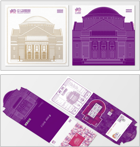 該套郵票特邀清華美術(shù)學院陳楠教授團隊設計,主票畫面以“清華紫”結(jié)合豐富的變化層次為畫面主基調(diào),采用插畫形式表現(xiàn)了清華大學最具辨識度的校園歷史景觀——二校門,突出了校門的厚重感和歷史感,背景淡雅多姿的花朵為象征團隊精神的清華大學校花——紫荊花,飛舞的花瓣象征了勤奮學習的莘莘學子和默默耕耘的辛勤園丁。附票畫面以清華大學110年校慶專用標志為畫面主體,結(jié)合標志的網(wǎng)格制圖原理,并搭配燙金設計效果,形成理性、現(xiàn)代的設計風格,整體畫面積極向上、自由活潑,凸顯出校慶的熱烈氛圍。