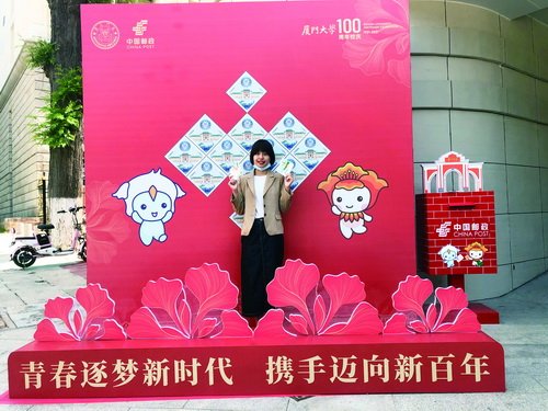 為獻禮廈大百年華誕,中國郵政集團特別為廈門大學校園主題郵局開通了廈門大學百年校慶專題個人定制郵票服務,校友和師生掃描中國郵政“微郵筒”二維碼進入郵票DIY界面,就可讓自己的照片登上郵票,將個人與廈門大學百年華誕珍貴瞬間一起定格,永遠珍藏。該服務支持線上、線下定制,在主題郵局網點內可立等可取。目前有“我在廈大等你”和“鳳凰花開 青春綻放”兩種版式可選。