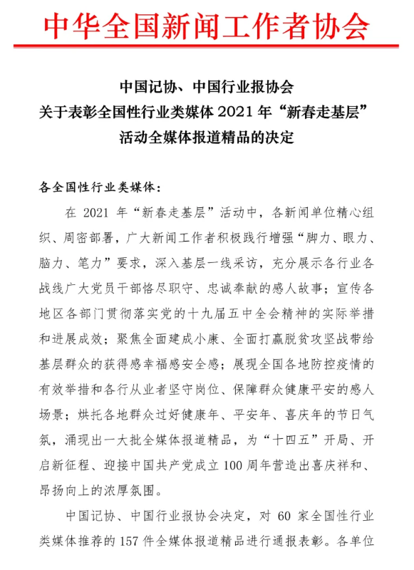 4月23日,中國記協(xié)、中國行業(yè)報協(xié)會發(fā)布關(guān)于表彰全國性行業(yè)類媒體2021年“新春走基層” 活動全媒體報道精品的決定,對60家全國性行業(yè)類媒體推薦的157件全媒體報道精品進行通報表彰。《中國郵政報》社的3件作品榜上有名,它們是:《這位郵政小哥憑啥上春晚》(程雪梅、陳顥月、楊佳昕、王勤東、雷浩彬),《家的味道》(呂磊、臧弋萱、張明月、汪堯、楊艷),《走郵路 看中國》(集體)。