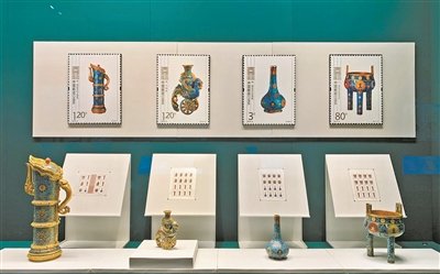 展覽現場,共展出郵票56套1732枚(含故宮主題郵票52套1590枚),郵票手稿等珍貴展品54件,聯合發行首日封13件;配合郵票展出的25件故宮文物,涵蓋書畫、玉器、琺瑯器、青銅器、瓷器、家具等多個門類,與同主題的郵票對比展出,交相輝映。