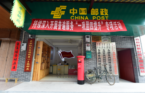 剛一走進離伯公凹不遠的金砂紅色小鎮,就能感受到濃烈的紅色文化氛圍——街道兩邊高高掛著紅旗,建筑上隨處可見五角紅星。“中央紅色交通線”第一主題郵局就位于小鎮的中心位置,主題郵局門口有一個格外顯眼的紅色郵筒。
